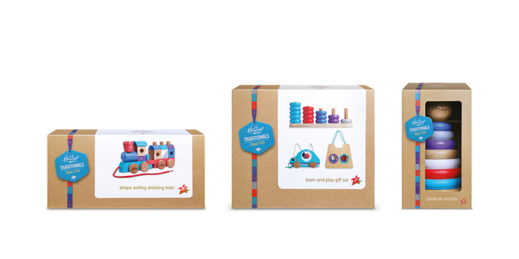 九十三設計創意團隊曾在各種項目上與多年Hamleys,和選擇帶來的新玩具收藏生活。該小組選出了使用棕色紙的所有的包裝,以反映這一系列的玩具產品的可持續性。調色板包括Hamleys品牌的紅色,但卻出乎意料地只作為次要的顏色深淺的藍色和紫色的中心舞臺。顏色有一個很好的深度,他們不是你平常的Crayola盒初選。而且,它們被用于玩具包裝和木制玩具本身。